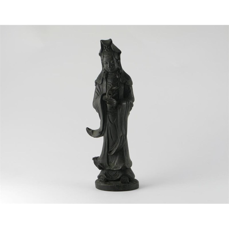A Chinese bronze Ming-style standing figure of Guanyin, standing holding a flask in her left hand, damages, 25.5cm.