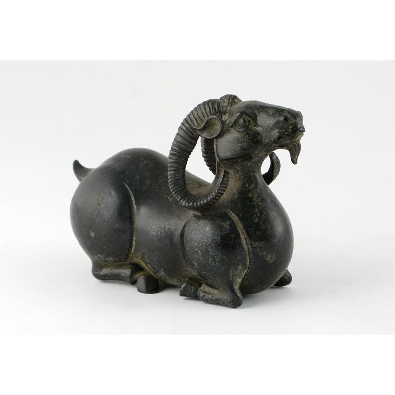 **A Chinese bronze model of a ram, with long curled horns, crouching with his head raised, 11.5cm.