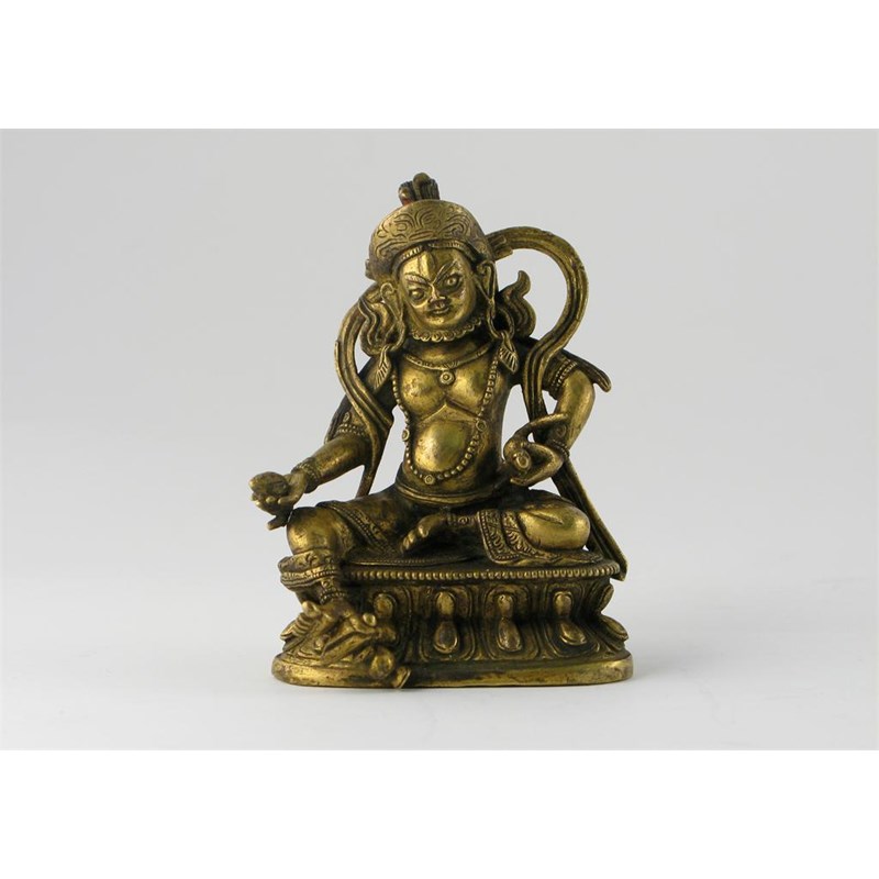 **A Chinese gilt bronze figure of Kubera, holding a peach and a mongoose, his right leg raised on a conch shell, 18th century, 10cm.