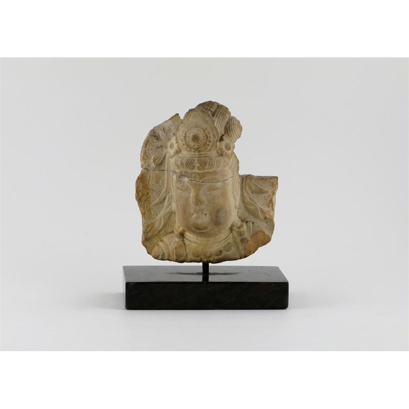 A Chinese marble carving of the head of Guanyin, turned slightly to dexter, old damage, 16cm.