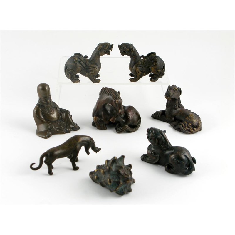 A Chinese bronze model of a horse licking its hind leg, and seven other models of fabulous beasts, a shell and Shoulao, 19th/20th century, 7.8cm max. (8)