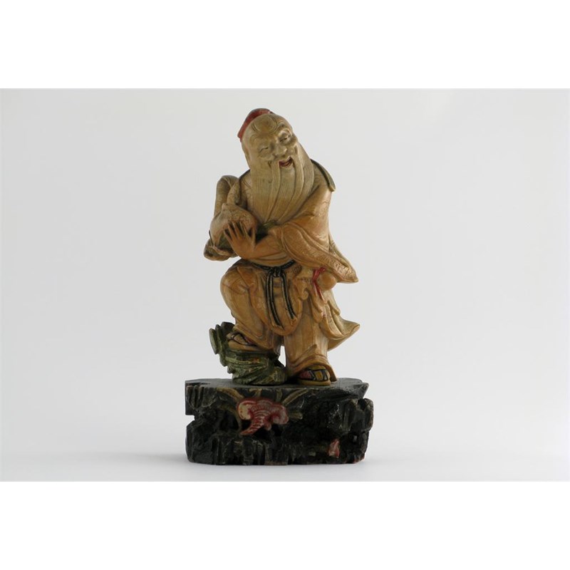 A Chinese soapstone carving of Shoulao, standing, holding the peach of immortality, 19th century, 21cm.
