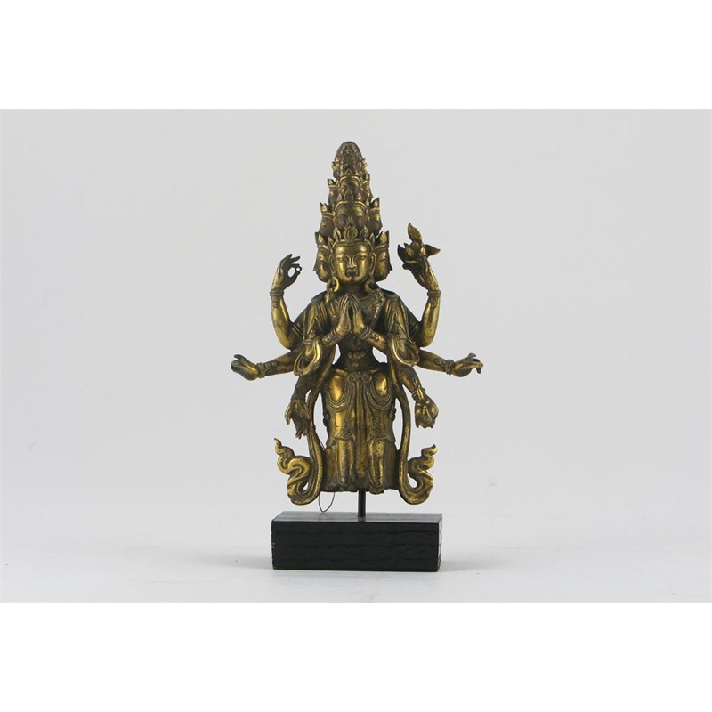 **A Chinese gilt bronze figure of Avalokitesvara, holding various attributes in his eight arms, 18th century, damages, 15cm.