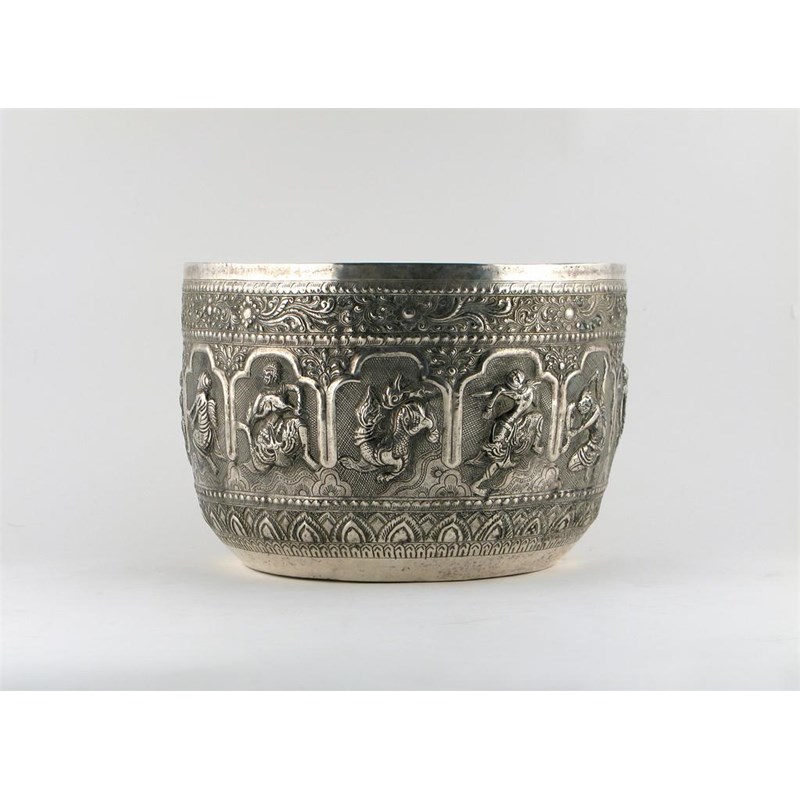 A South East Asian silver-coloured metal bowl, embossed with twelve panels of figures and animals beneath floral borders, the base inscribed 'Charles Napier Stewart to George H Lewis 1876', 26.5cm.