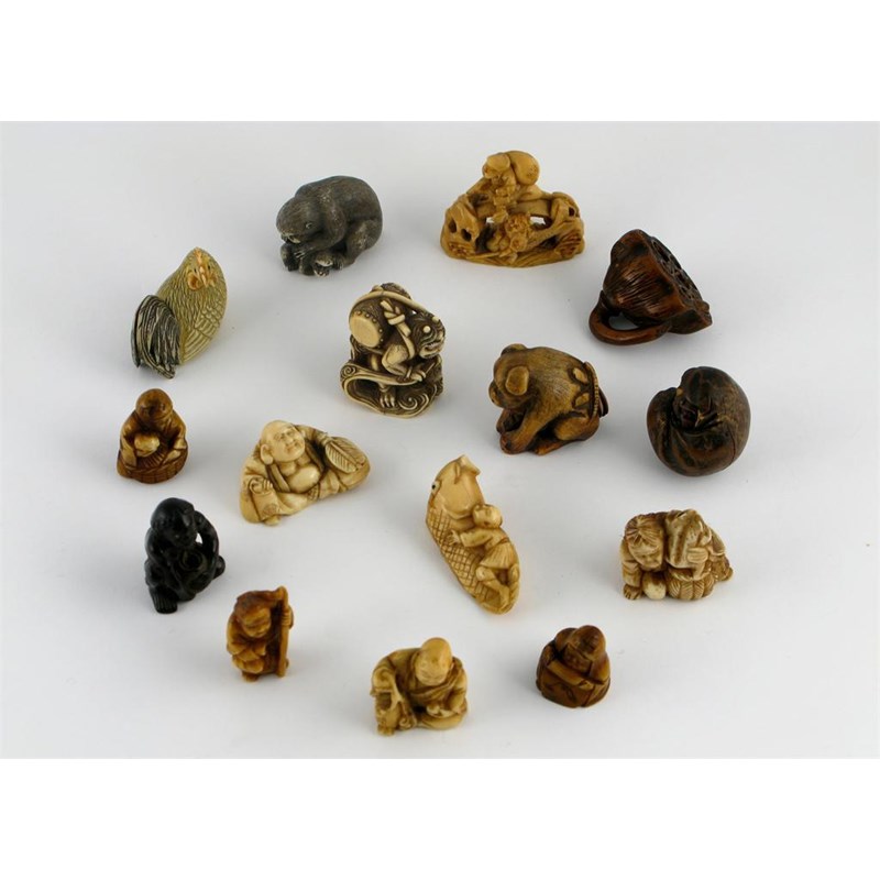 A Japanese ivory netsuke, carved as a man straddled on a giant rat, rescuing a man from a fish's back before it plunges into the sea, and eight other in ivory, three in wood, two in resin and one in bone, 19th/20th century, minor damages, 3.7cm max. (15)