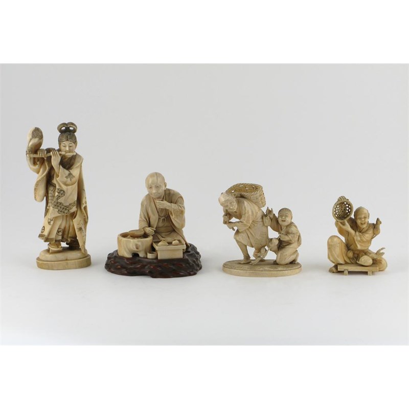 Four Japanese ivory figures, one of a bijin playing a flute, another of a man seated, drinking fish soup with stand, three signed, late 19th century, 17cm. (5)