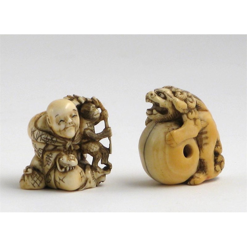 Two Japanese ivory netsukes, one carved as a lion dog crouching over a large ball, a loose ball rolls in its mouth, the other as a seated sorcerer holding a mask in his hand, a little monkey stands before him holding a branch, early 20th century, 3cm max. (2)