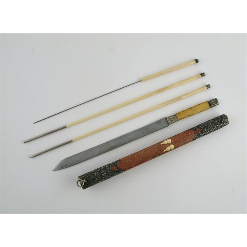 A Chinese ivory and silver coloured metal chopstick set, including a knife, a needle, and a pair of sticks, all contained in a red shagreen case with embossed metal mounts, 19th/early 20th century.