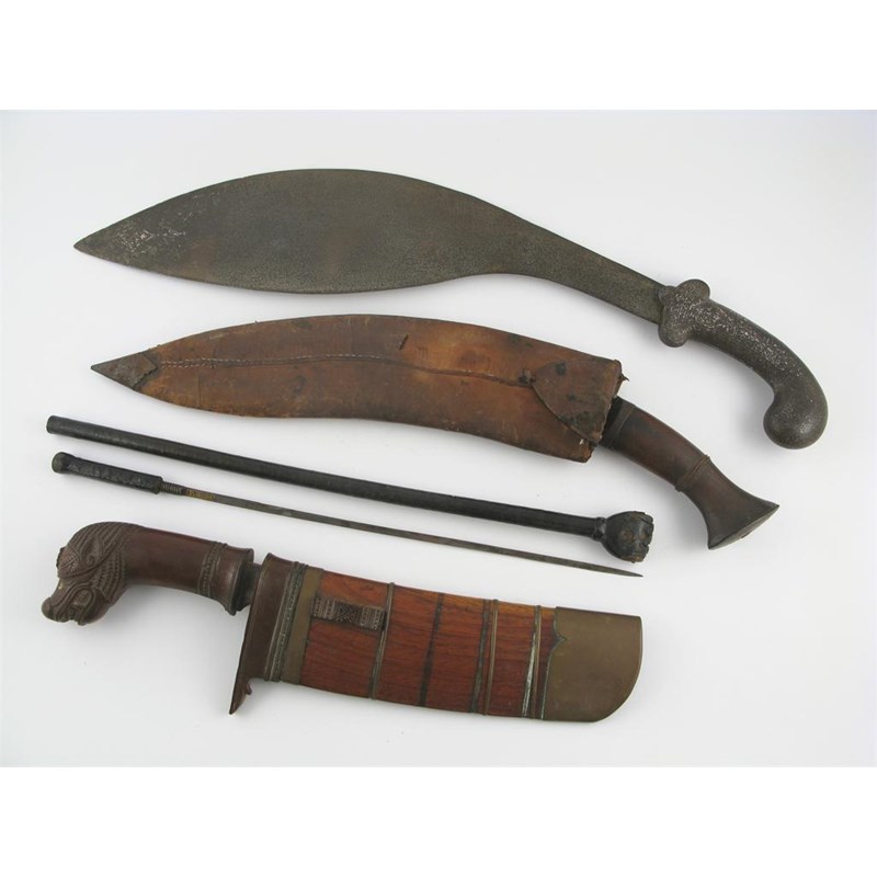 Two Khukuri knives, one with silver inlay, a back-scratcher enclosing a stiletto, and another short South East Asian knife, wear and damages, two with scabbards. (6)