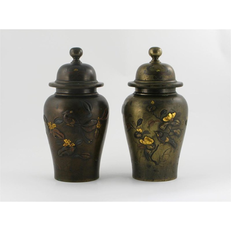 A pair of Japanese bronze ovoid vases and covers, inlaid and onlaid in gold, silver and copper with birds amid flowering magnolia, late 19th century, 29.5cm. (4)