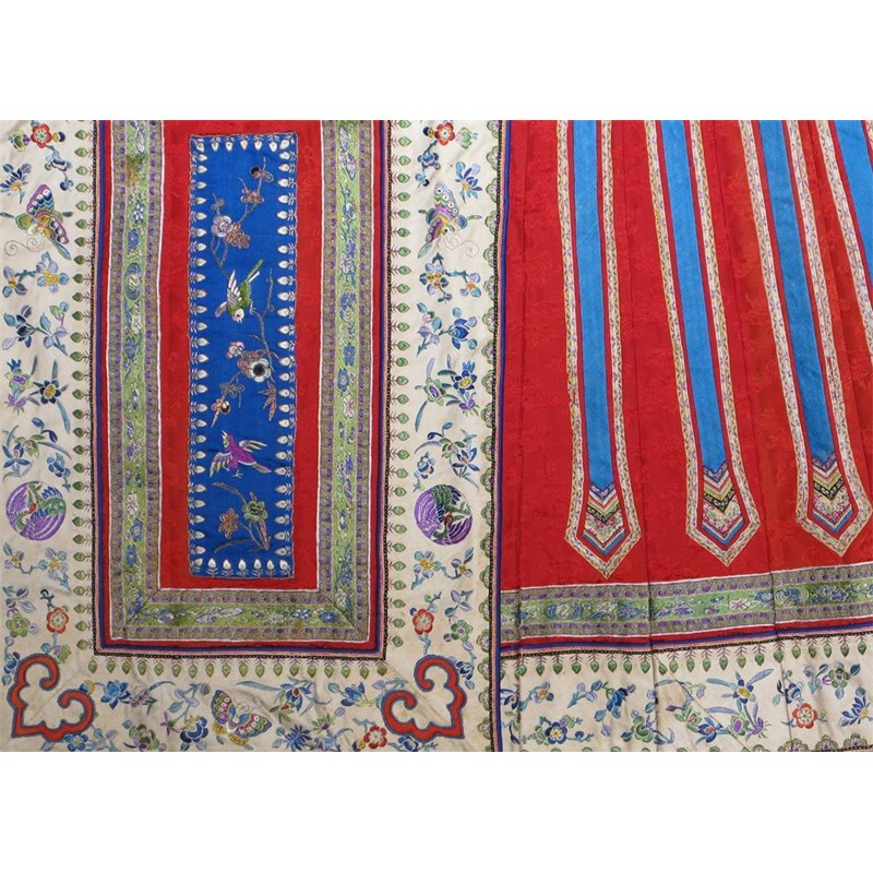 Two Chinese embroidered panels, decorated with butterflies, flowers and lappets on a red ground, formerly part of a skirt, c.1900. (2)
