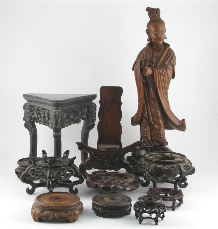 A Chinese hardwood caving of Guanyin, standing on a lotus throne, and fifteen various carved wood stands, mostly 19th century, 51cm max. (16)