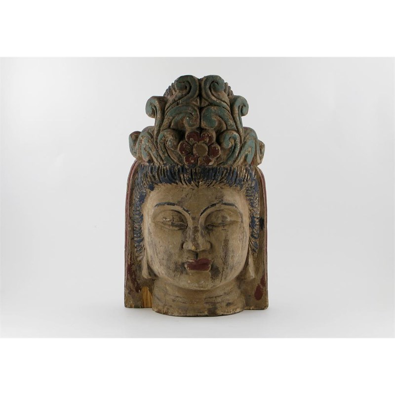 A Chinese carved wood head of Guanyin, details picked out in colour, 41cm.