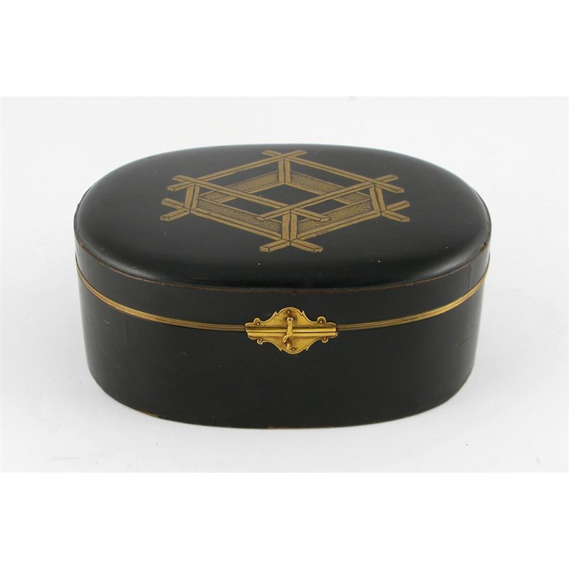 A Japanese black lacquer oval box, the hinged lid decorated with a geometric jardinière, the mounts finely engraved with scrollwork, 18th/19th century, minor surface damages, 17cm.