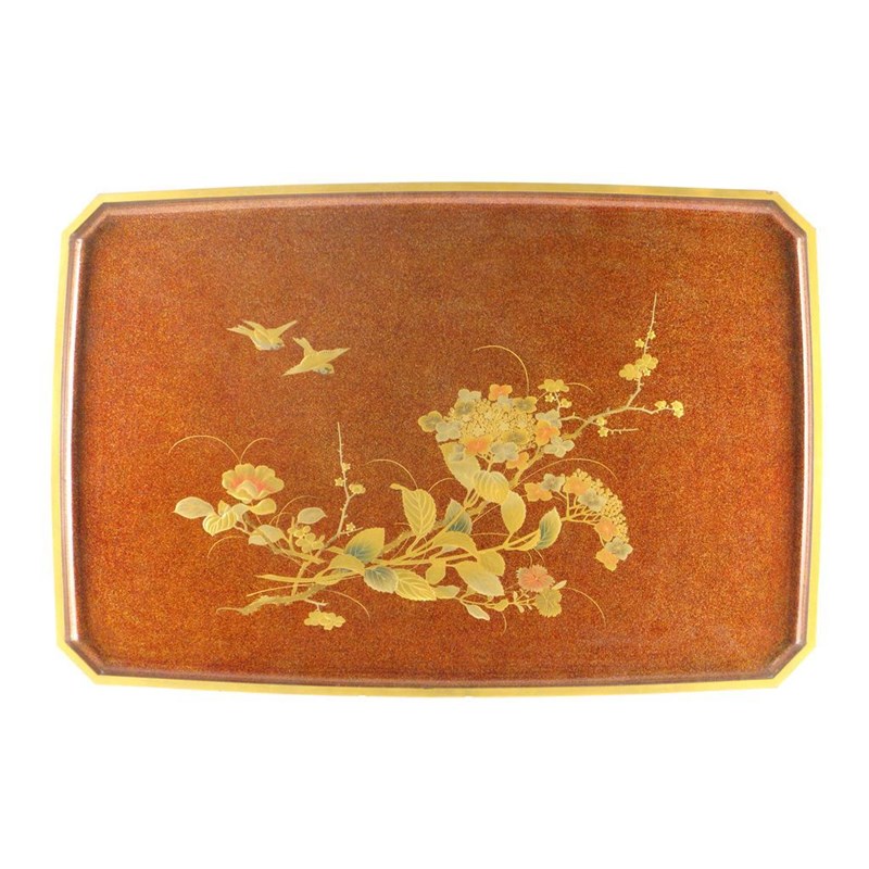 A large Japanese rectangular lacquer tray, decorated in gold with two small birds above hydrangea, prunus and magnolia sprays on a nashiji ground, 19th/20th century, a small rim chip, 56cm.