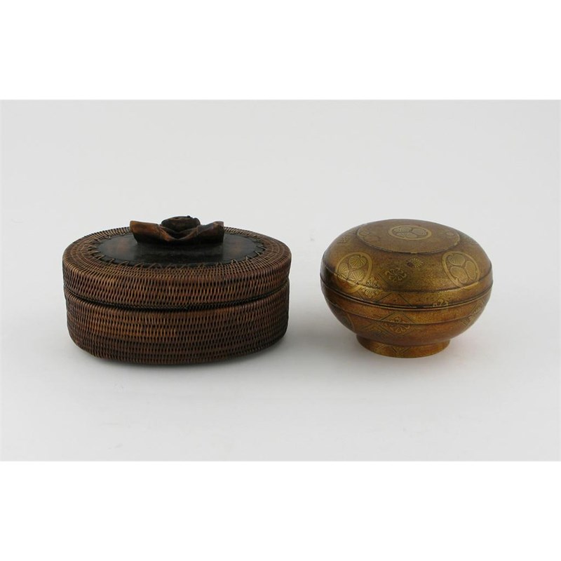 A Japanese gold lacquer circular box and cover, decorated with paulownia mon, and an oval wicker basket with a carved crab finial, 19th/20th century, 17cm max. (4)