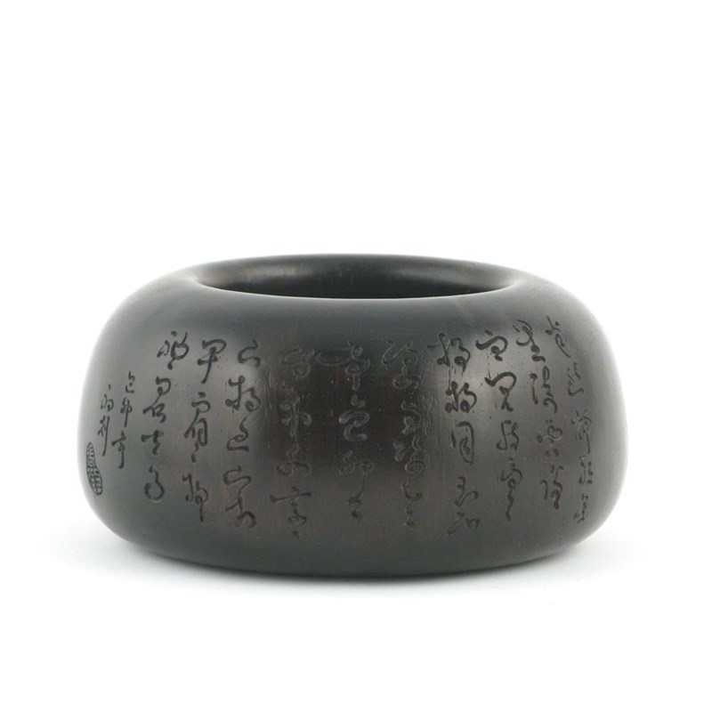 A Chinese hardwood turned brushwasher, with twelve lines of script, 19th/20th century, 13cm.