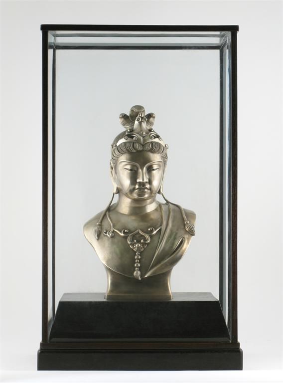 A large Japanese silver bust of Kwannon, with a fierce expression and scrolling headdress, punch marks to the base, 20th century, 38cm, contained in a glass display case, 62.5cm overall.