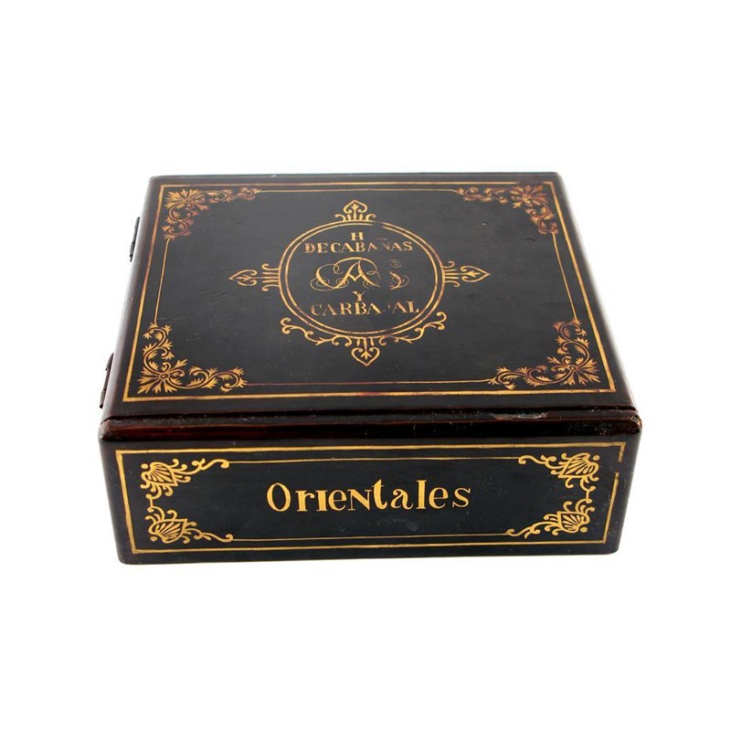 A black lacquered armorial cigar box, decorated in gold and inscribed 'H Decabanas y Carbajal', 'Orientales' and 'Flor Fina' to the sides, the interior with an elaborate coat of arms, 19th century, 18.5cm.