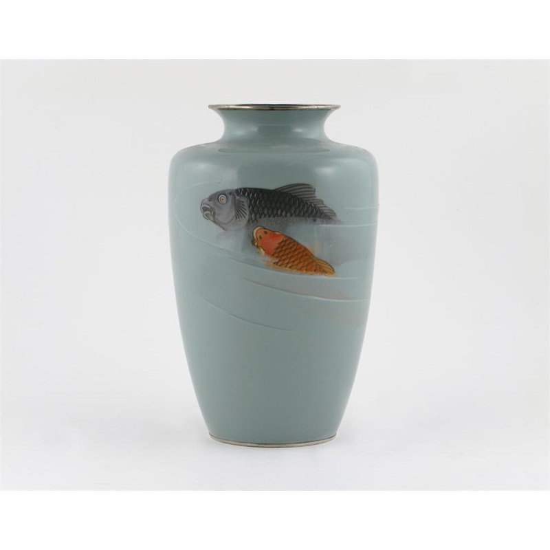 A Japanese musen enamel vase, decorated with carp rising from cloudy waters, unmarked, the rim and foot with silver-plated mounts, Meiji 1868-1912, 24cm.