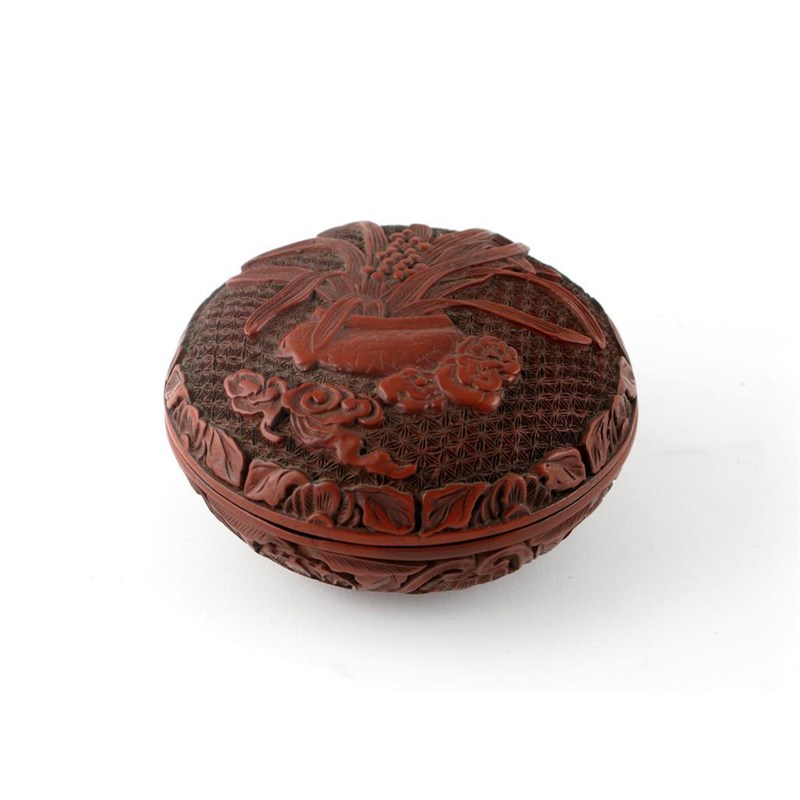 **A Chinese red lacquer circular box and cover, decorated with a vase of orchids and bands of stylized flowers, probably 18th century, 10cm. (2)