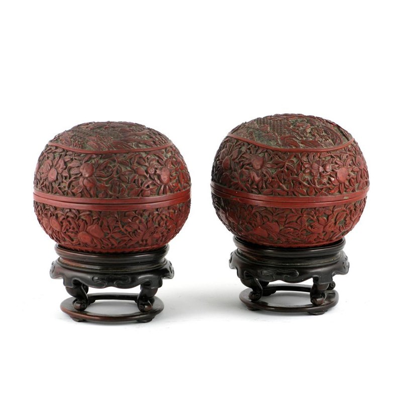 A pair of Chinese lacquer peach-shaped boxes, both carved with a Daoist immortal in a landscape, with borders of leafy branches of pomegranates, finger citrons and peaches, 19th century, damages, with wood stands, 14cm. (6)