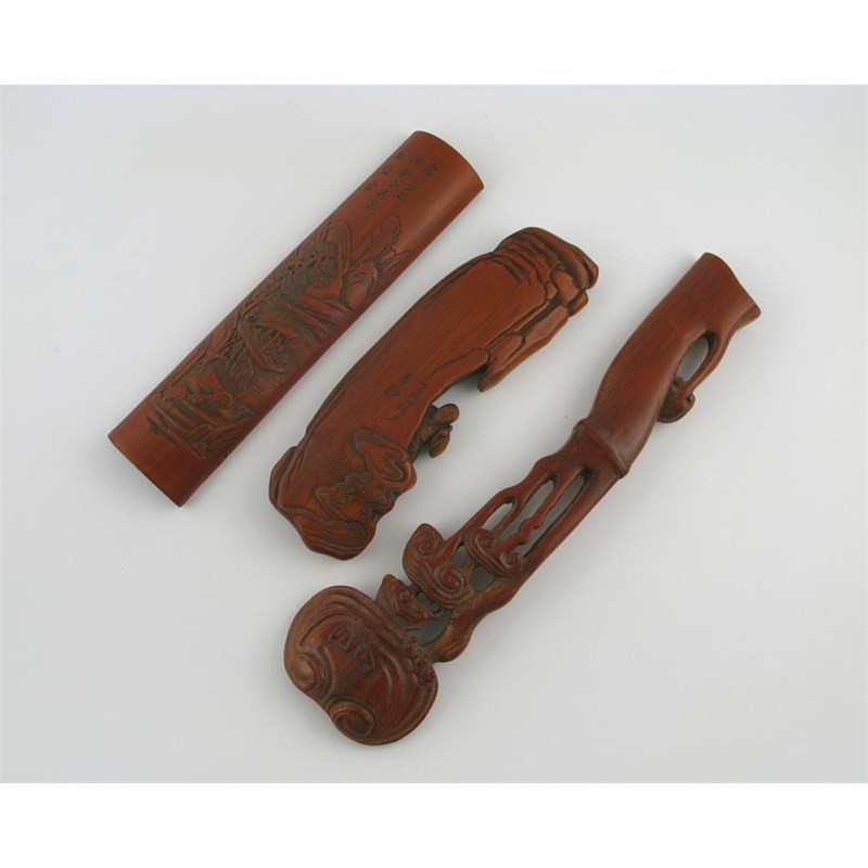 Three Chinese bamboo wrist rests, one carved as a ruyi sceptre, one carved with a figure in a rocky landscape, the third carved with figures in boats, one inscribed with the date, 9th month ding you year (1837/1897), 29.5cm. (3)