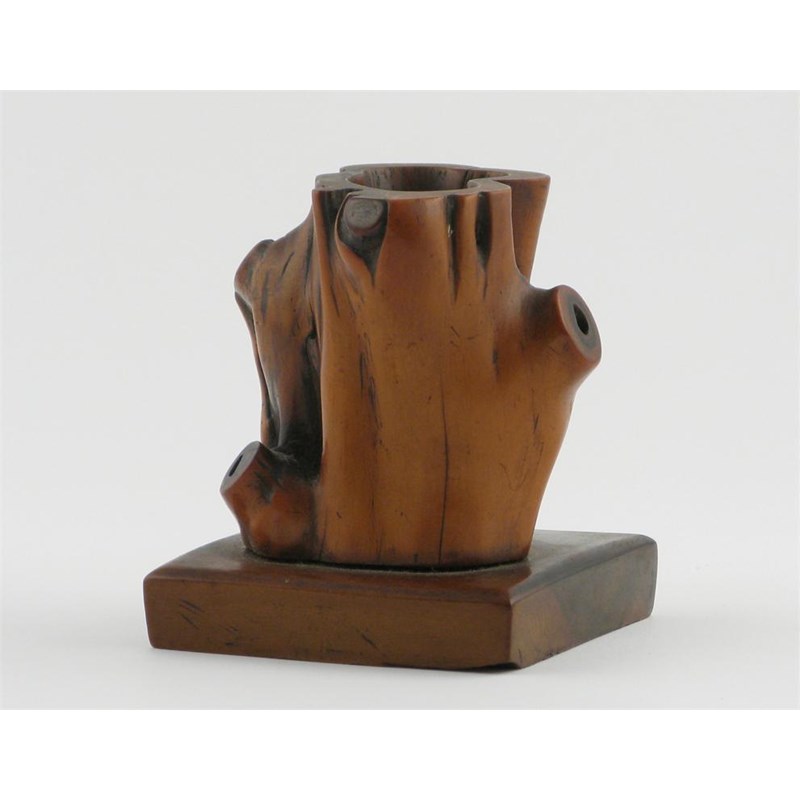 A Chinese hardwood brushpot, with a smooth patina, mounted on a wood base, 18th/19th century, some splits to the brushpot, 10cm.
