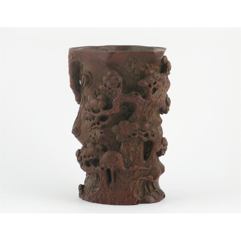 A Chinese bamboo brushpot, carved with two cranes standing beside a large pine tree, the reverse with ruyi fungus and bamboo, 14cm.