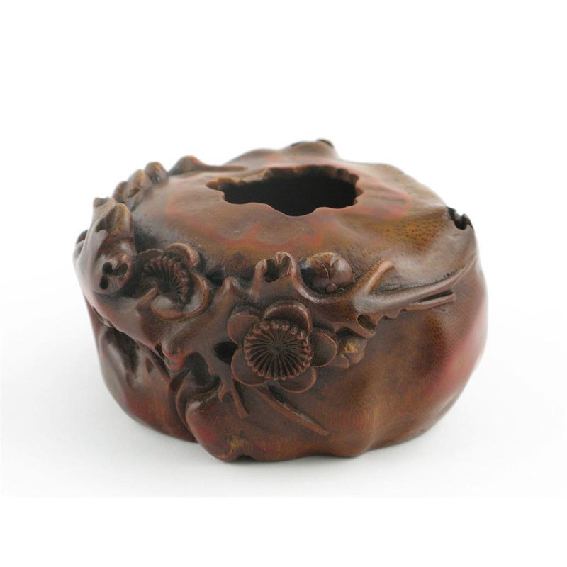 A Chinese bamboo brushwasher, carved with prunus blossom, 10cm.