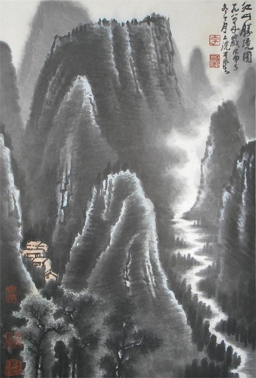 A Chinese scroll painting, depicting small huts in a mountainous landscape, inscribed 'Li Keran, painted 10th month 1984', 68cm.