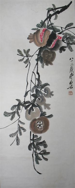 A Chinese scroll painting of a fruiting pomegranate branch, inscribed 'Qibaishi in his 83rd Year', 124cm.