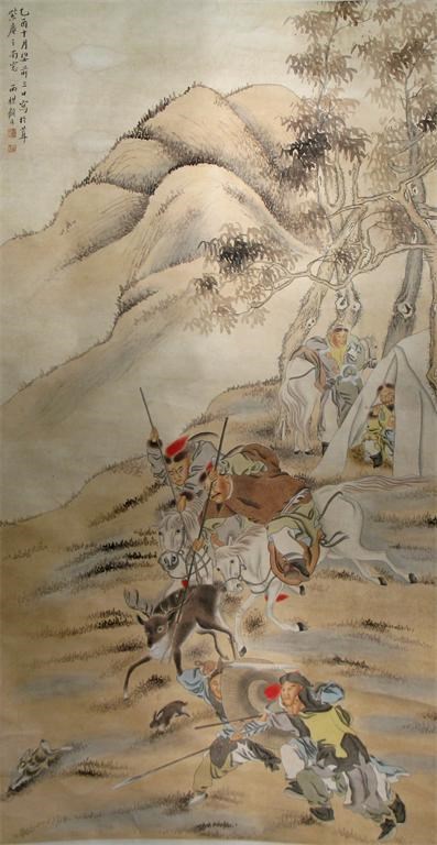 A large Chinese scroll painting, depicting a hunting scene, inscribed with the 10th month of the Yi You year corresponding to October 1885, 162cm x 87cm.