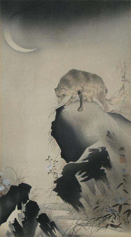 19th century Chinese school, an ink painting heightened in gouache of a wolf-like beast standing on a rock above a mountain stream, beneath a crescent moon, two character signature and seal marks, 33.5cm x 18.5cm.