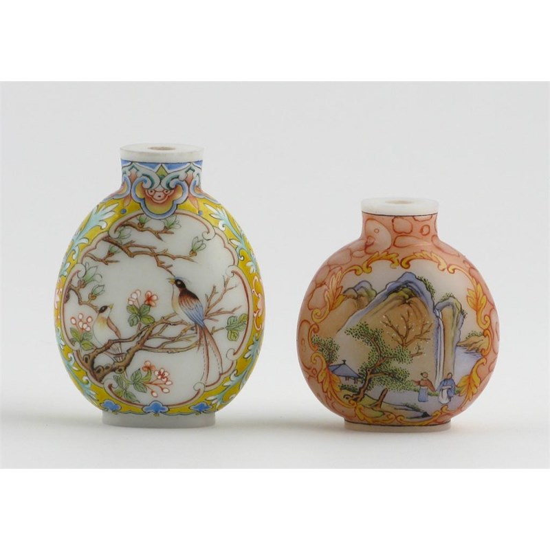 Two Chinese opaque white glass snuff bottles, one painted with two panels containing birds on a yellow ground, the other with two figures in mountainous landscapes, both with four character Qianlong marks but 20th century, 6cm. (2)