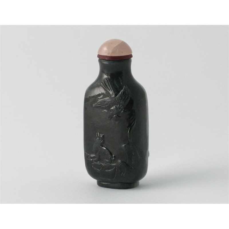 A Chinese black and white jade snuff bottle, one side carved with a cat looking up at a flying bird, the reverse with a butterfly above an orchid, c.1900, 7.5cm.