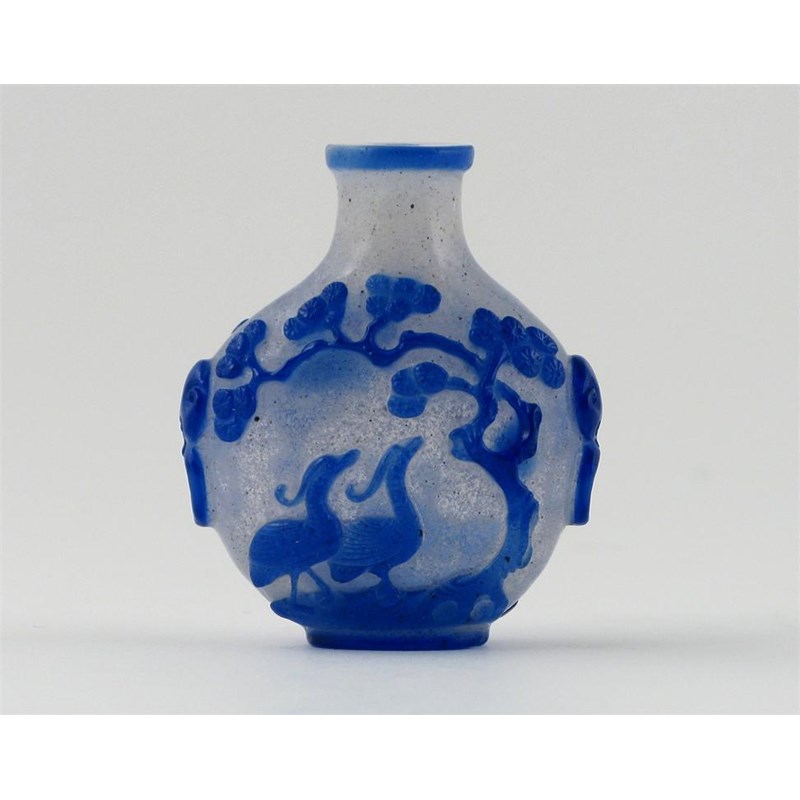 A Chinese glass snuff bottle, overlaid with four cranes beneath pine trees, in blue on a snow storm ground, 5.5cm.