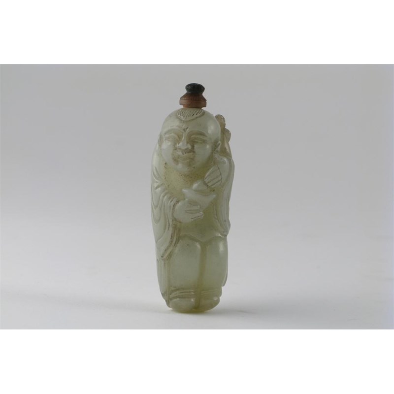 **A Chinese pale celadon jade snuff bottle, carved as a small boy eating from a bowl, 7cm.