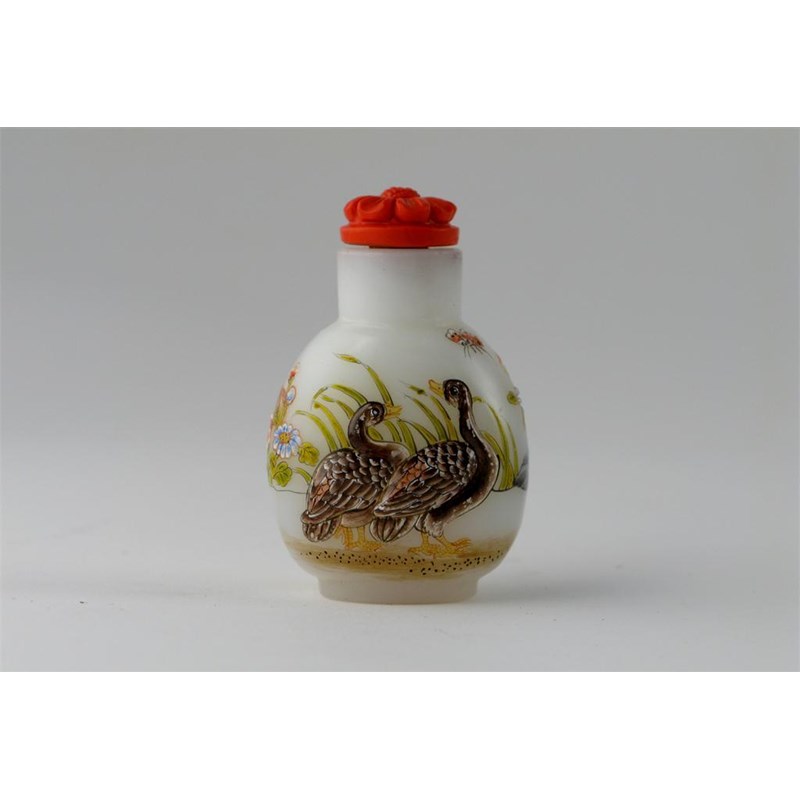 **A small Chinese opaque white glass snuff bottle, enamelled in relief with geese among flowers and grasses, the base with a three character mark, 5.2cm.