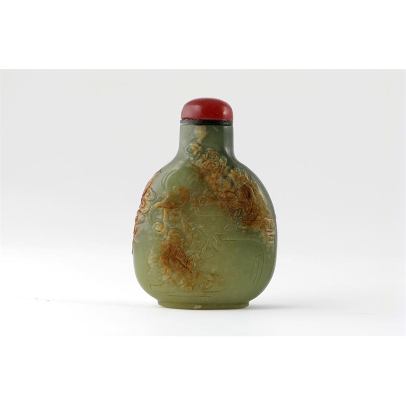 **A Chinese yellow green jade snuff bottle, carved in shallow relief with figures floating on clouds, 18th century, 7.5cm.