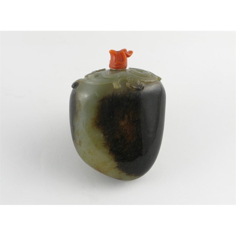 A Chinese jade snuff bottle, carved from a rounded pebble, two bifid dragons carved beneath the coral stopper, 18th/19th century, 8cm.