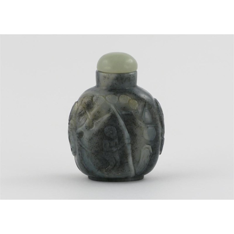 A Chinese black and white jade snuff bottle, boldly carved with a monkey standing beneath a pine tree between chilong dragon handles, the reverse with bamboo and rockwork, 19th century, 7cm.