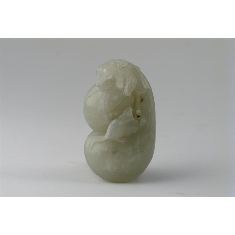 **A Chinese white jade carving, of a rat, two bats and a ruyi fungus on two large fruits, probably 19th century, 7.5cm.