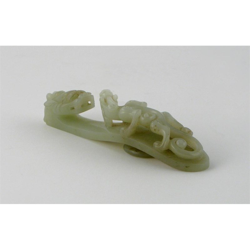 A Chinese pale celadon jade belthook, carved with a bifid dragon, 19th century, 12.2cm.