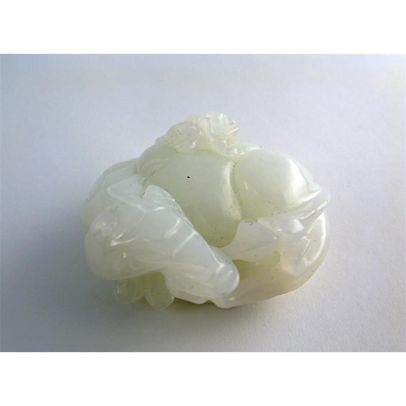 **A Chinese white jade carving of a recumbent horse, curled, so his hoofs and tail touch his mouth, a monkey lies sprawled on its back, probably 19th century, 5.5cm. The horse and monkey combined were often given to aspiring officials.