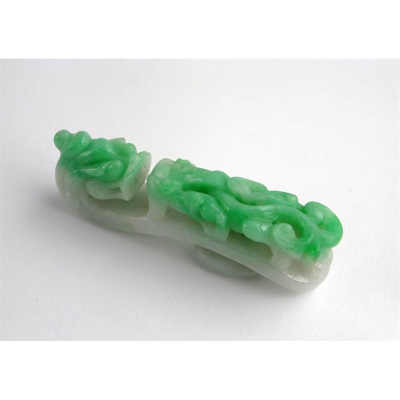 A Chinese jadeite belt buckle, carved with a dragon's head and the body decorated in relief with a stylized bifid dragon, highlighting the stone's apple green colour, 19th century, 6.5cm.