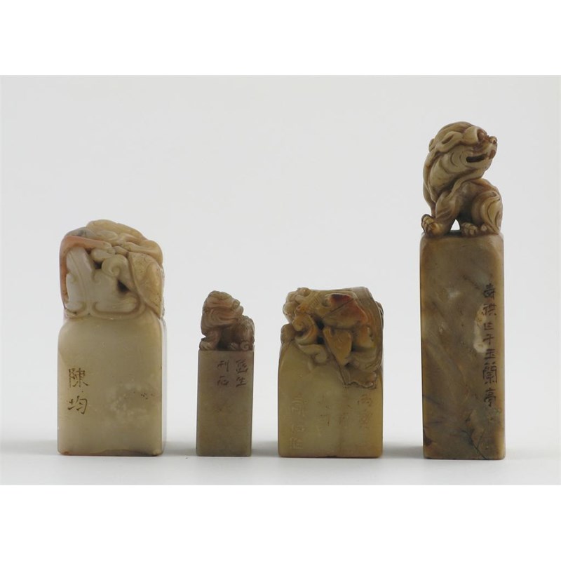 Four Chinese soapstone seals, carved with lion dogs and incised with Chinese characters, 19th/20th century, one with fissures, 10.5cm max. (4)