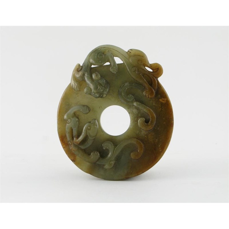 A Chinese jade bi disc, carved in relief with two mythical creatures, 17th century, 9cm.