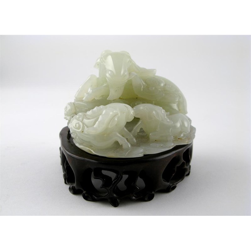 **A fine Chinese white jade carving of a ram, perched on rockwork and holding a scrolling branch in its mouth with a yin yang symbol, two young lie at his feet on a swirling cloud base, 20th century, 7.5cm, raised on a modern stand. (2)