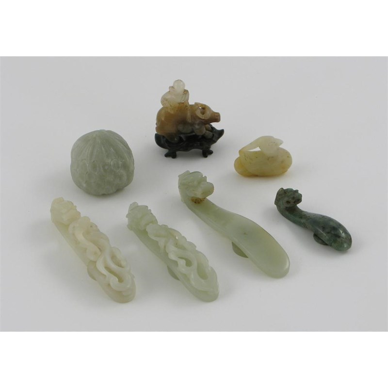 Four Chinese jade belt buckles, two carved with dragons, a miniature jade duck, a jade carving of a boy riding a water buffalo on a wood stand, and an unusual Chinese jade walnut, 9.5cm max. (8)